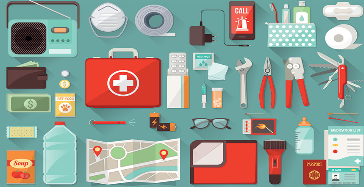 - First aid kit (plastic bandages, allergy medications, ointments, alcohol pads, creams, gauze, tweezers, one-time band-aids, and anti-biotic cream)